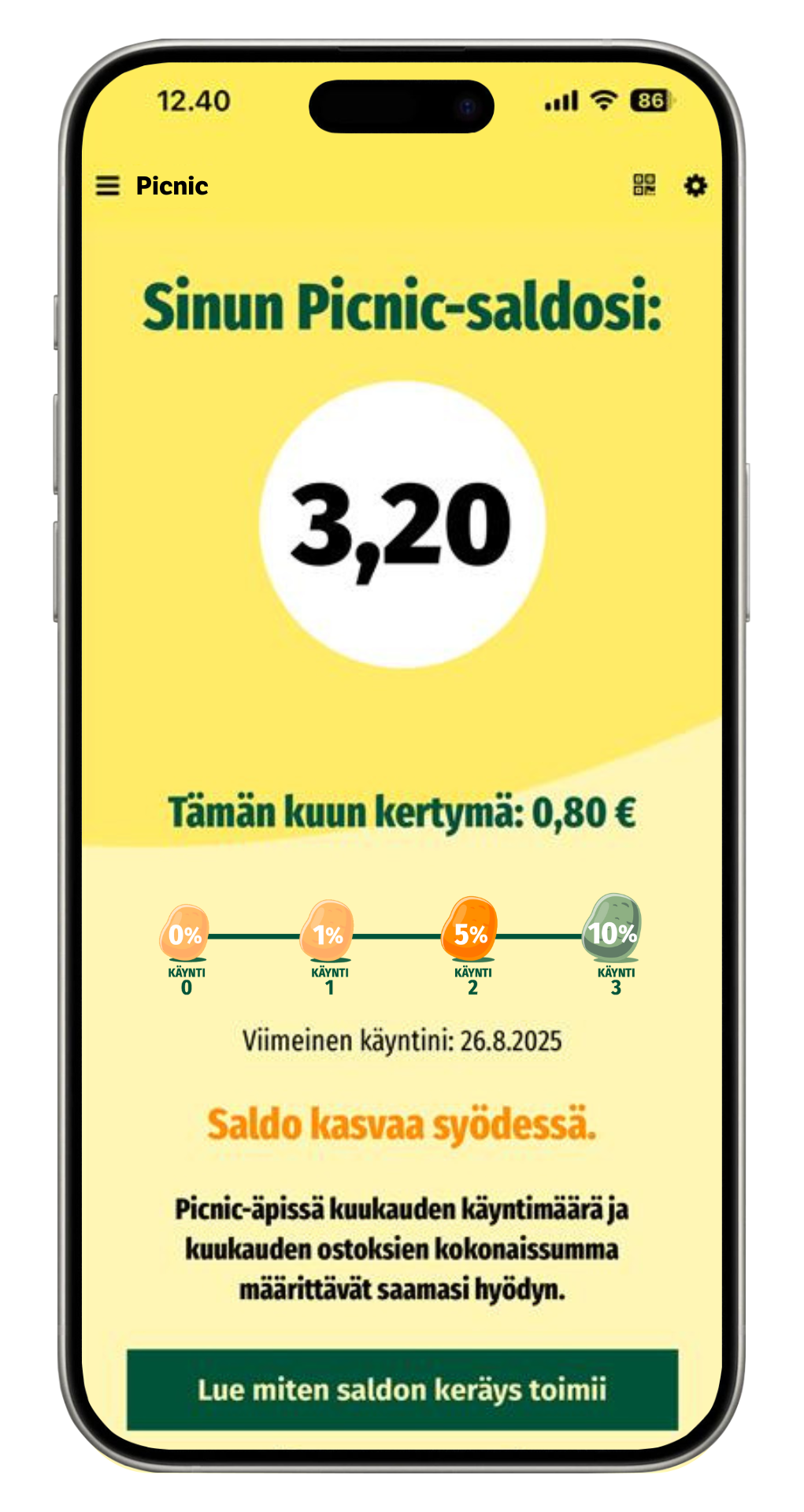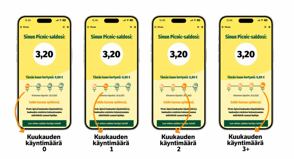 1.10.2025 eteenpäin ansaitset Picnic-saldoa käyntiesi ja käyttämiesi eurojen mukaisesti (kts. ”Miten ansaitsen saldoa”)