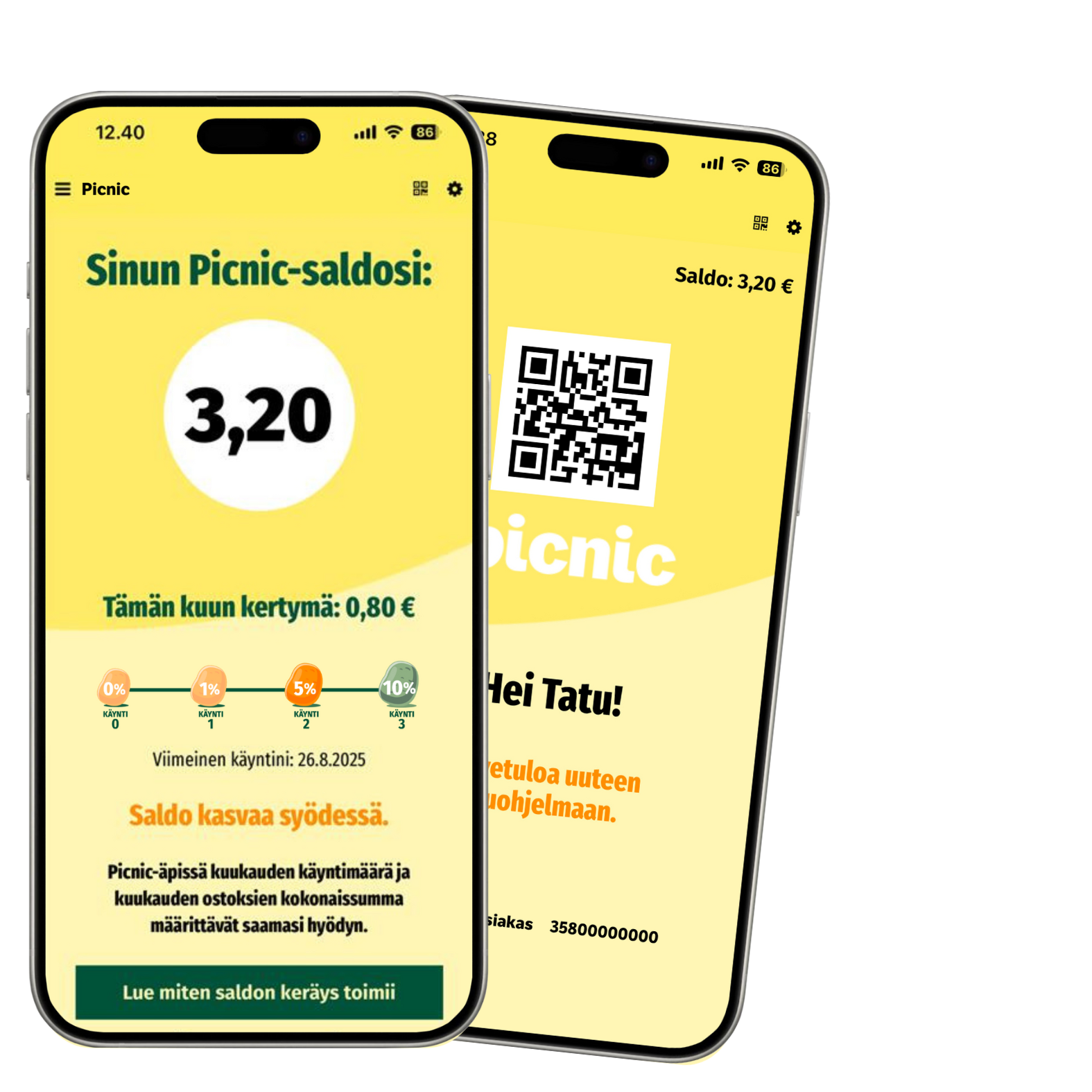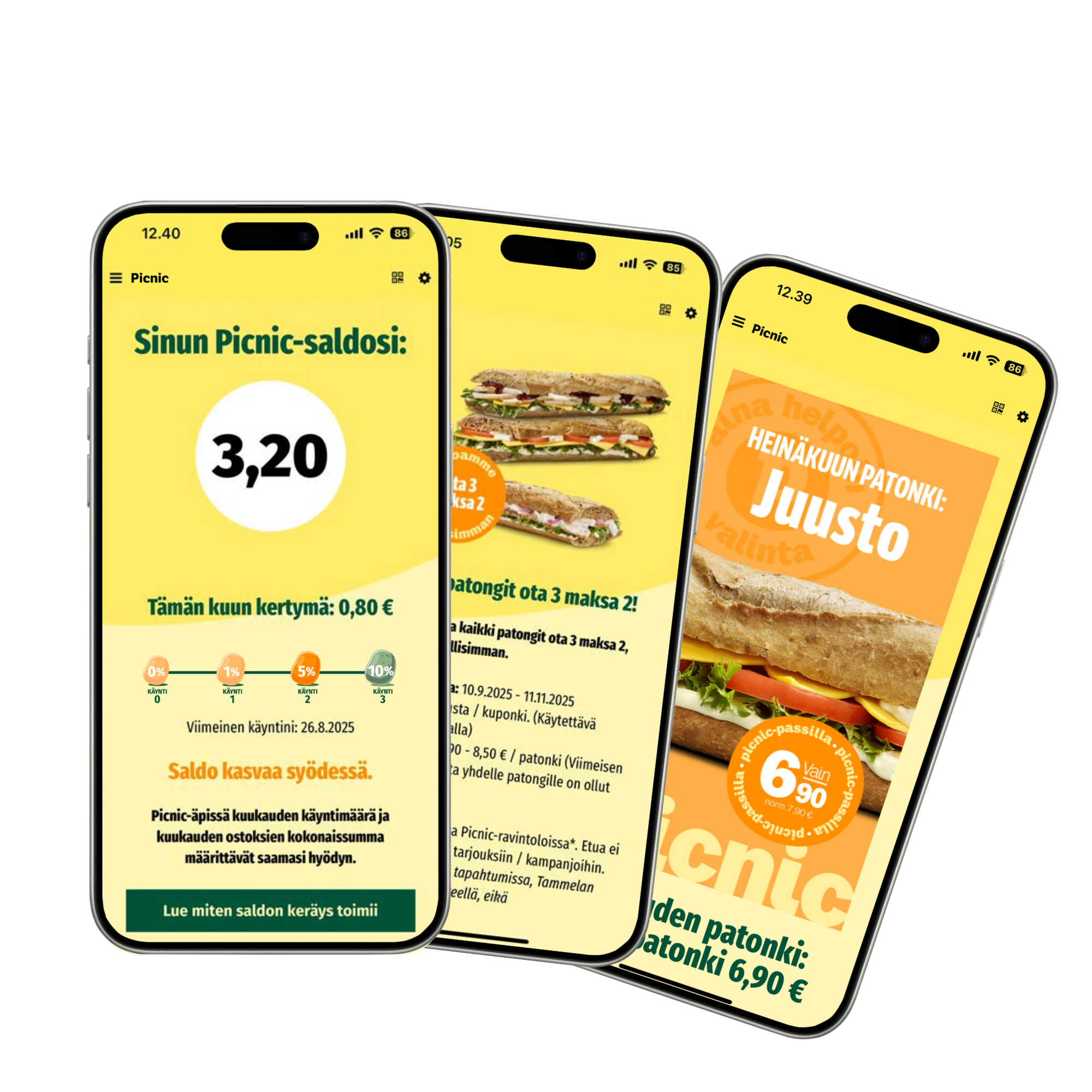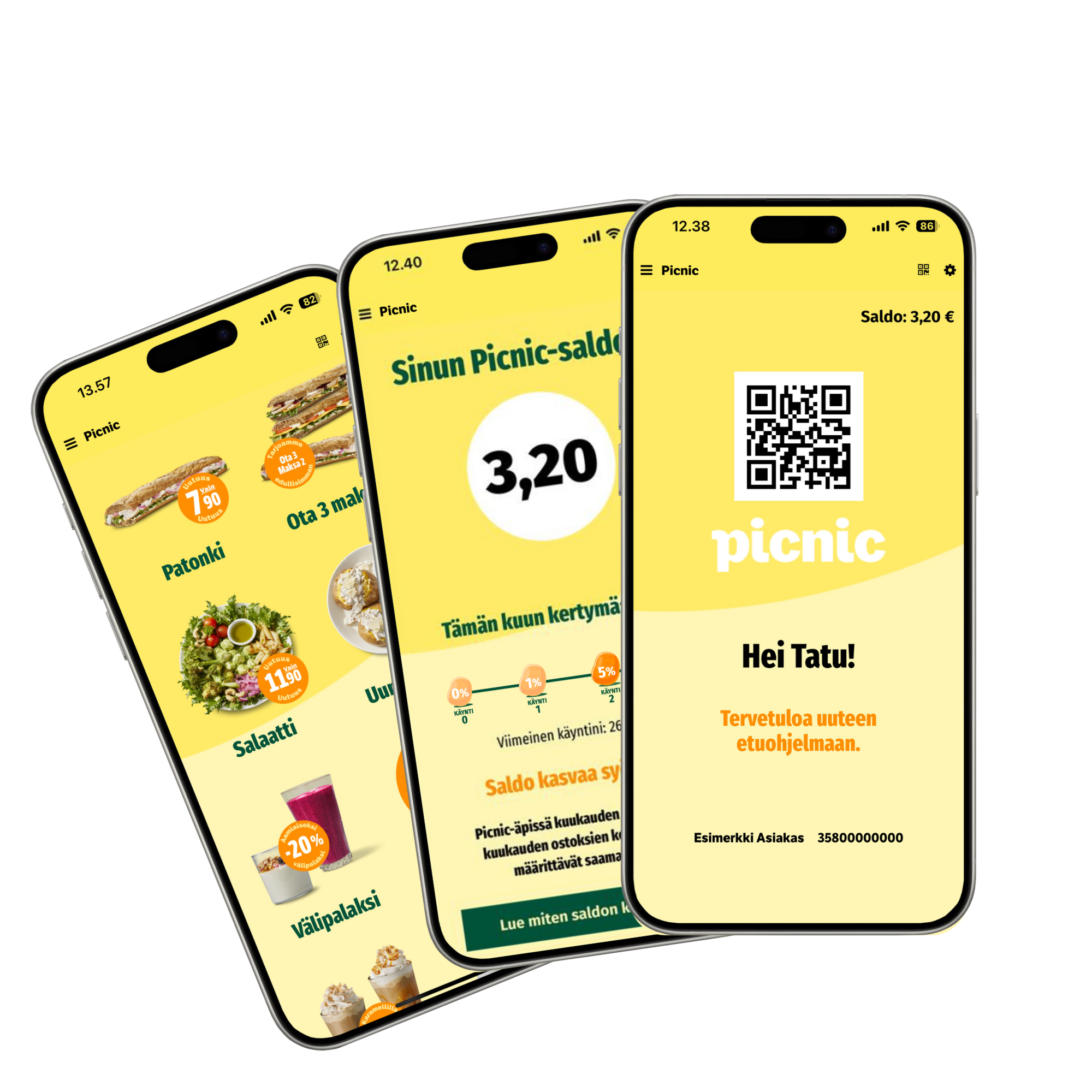 Uudistimme Picnicin kanta-asiakasohjelman. Asiakastietosi, eli nimesi, puhelinnumerosi, markkinointisuostumuksesi ja muut antamasi tiedot, pysyvät ennallaan. Sovellus ja etuohjelma uudistui 1.10.2025. Ansaitsemasi saldo siirtyy uuteen ohjelmaan ja leimat hyvitetään käynneiksi ensimmäisen kuukauden ajaksi.