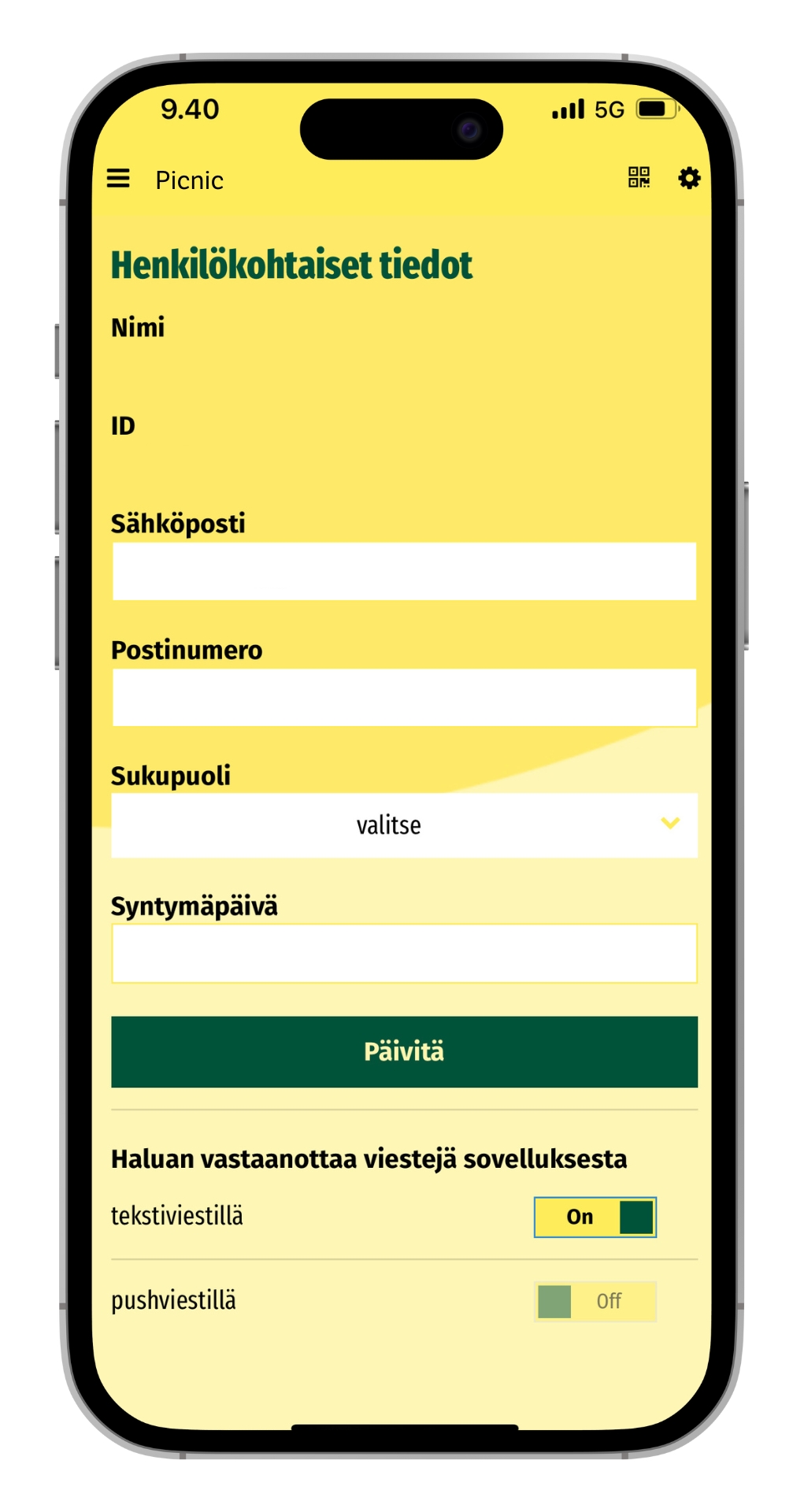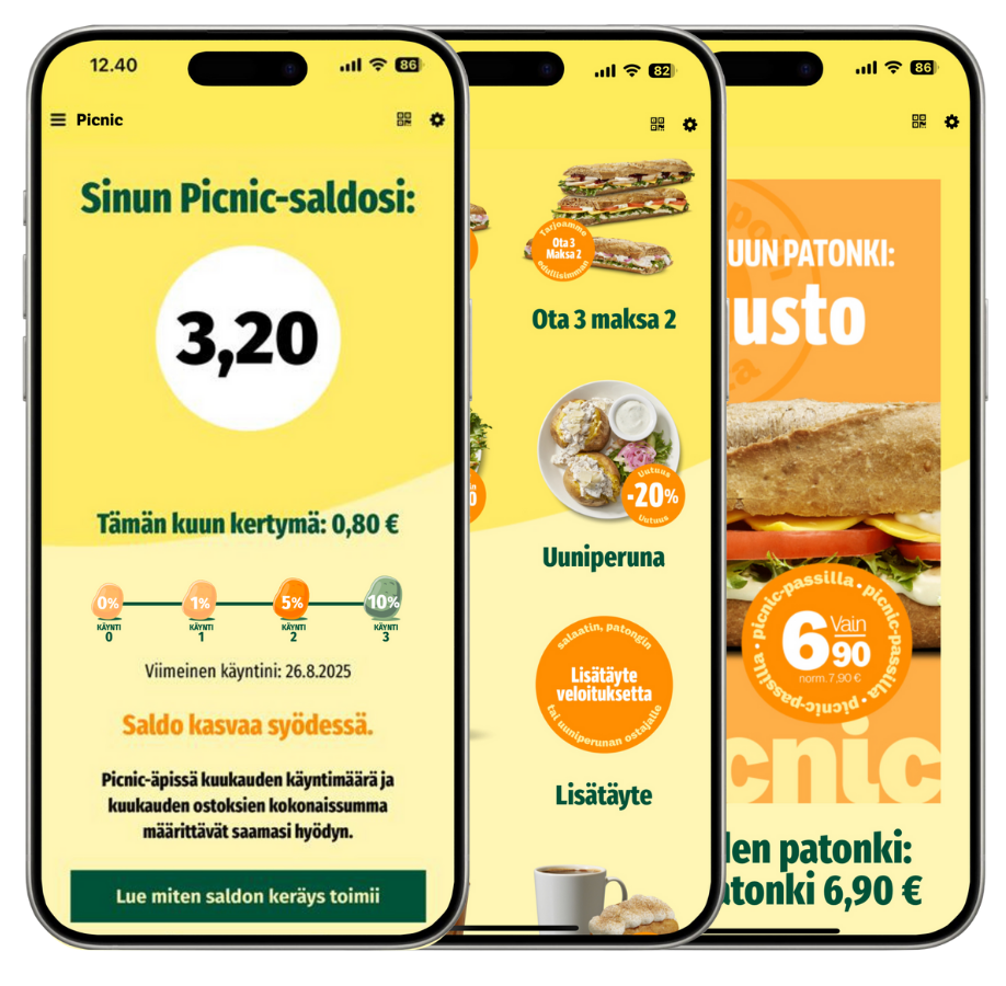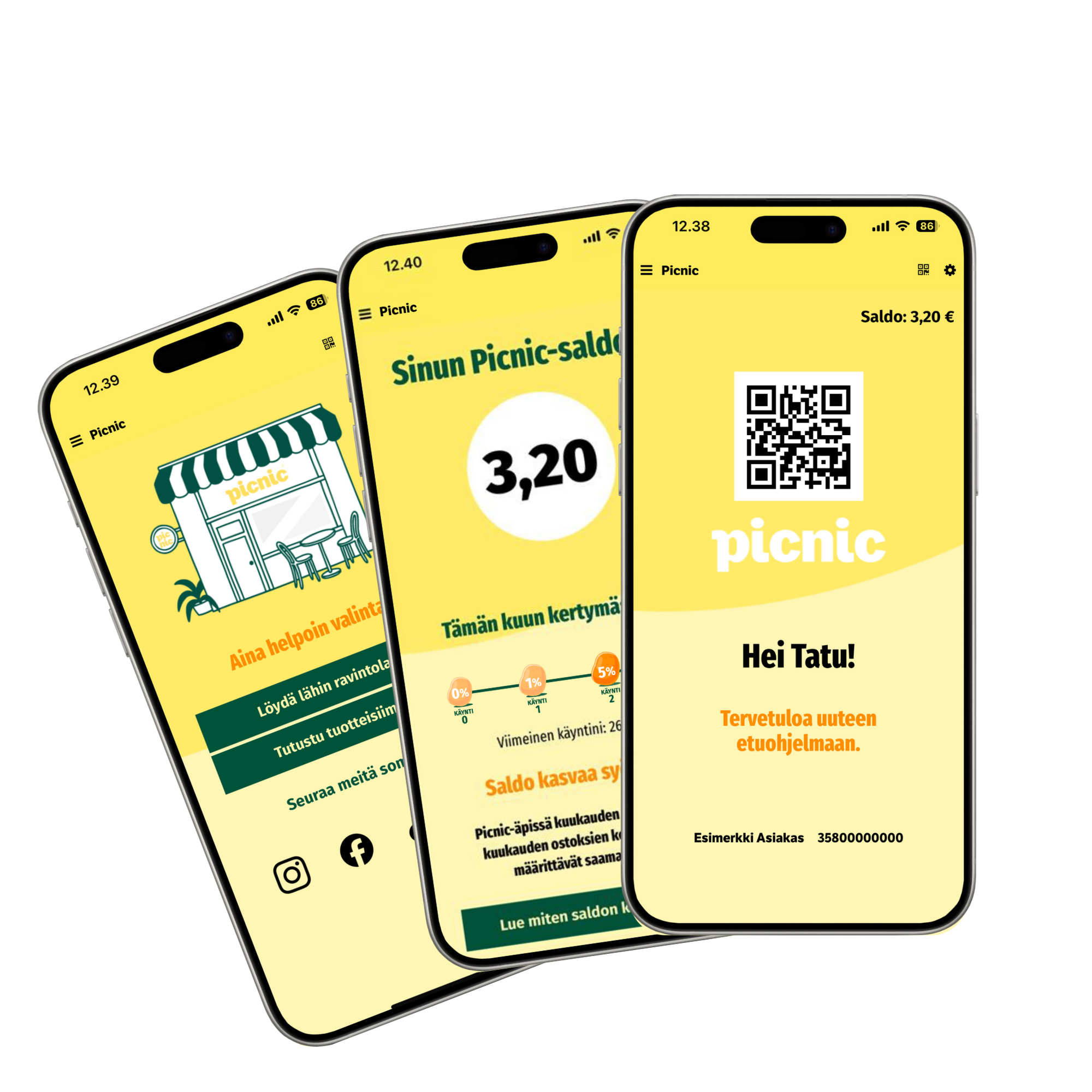 Uudistimme Picnicin kanta-asiakasohjelman. Asiakastietosi, eli nimesi, puhelinnumerosi, markkinointisuostumuksesi ja muut antamasi tiedot, pysyvät ennallaan. Sovellus ja etuohjelma uudistui 1.10.2025. Ansaitsemasi saldo siirtyy uuteen ohjelmaan ja leimat hyvitetään käynneiksi ensimmäisen kuukauden ajaksi.