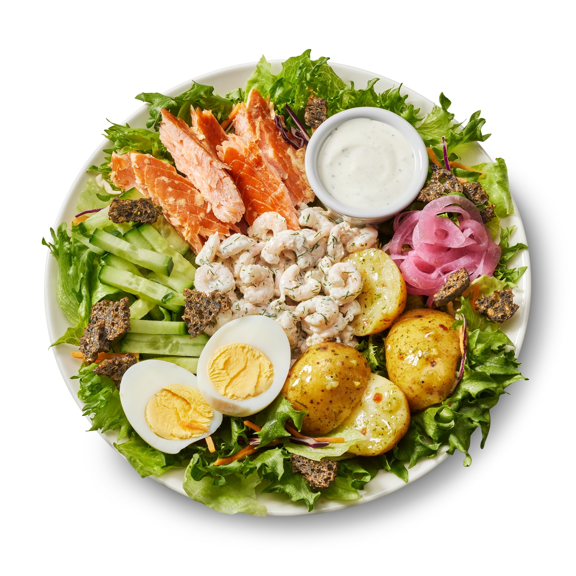 Crispy salad mix, warm smoked salmon (FI/DK), shrimp sardines (MSC), egg, herb marinated potato, pickled red onion, cucumber, seed cracker crumble and Picnic sour cream sauce.