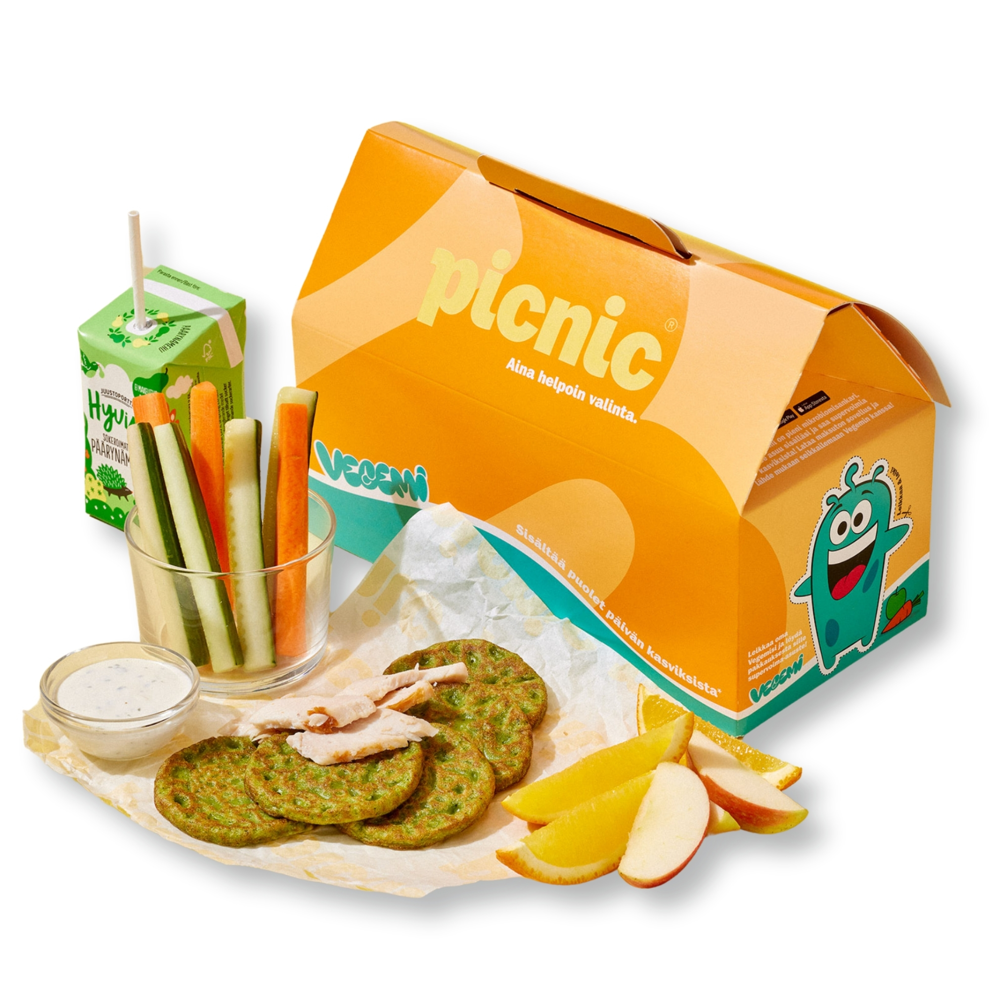 Finland’s smartest kids’ meal delivers half of the day’s vegetables – with no added sugar. The meal includes spinach pancakes with a filling, Picnic’s baked potato sauce, cucumber and carrot sticks, orange and apple wedges, plus a drink. Every meal also comes with a Vegemi collectible card that combines food education with play. Use the card digitally or turn it into a fun DIY accessory for the Vegemi character on the box. Picnic encourages kids to eat more vegetables.