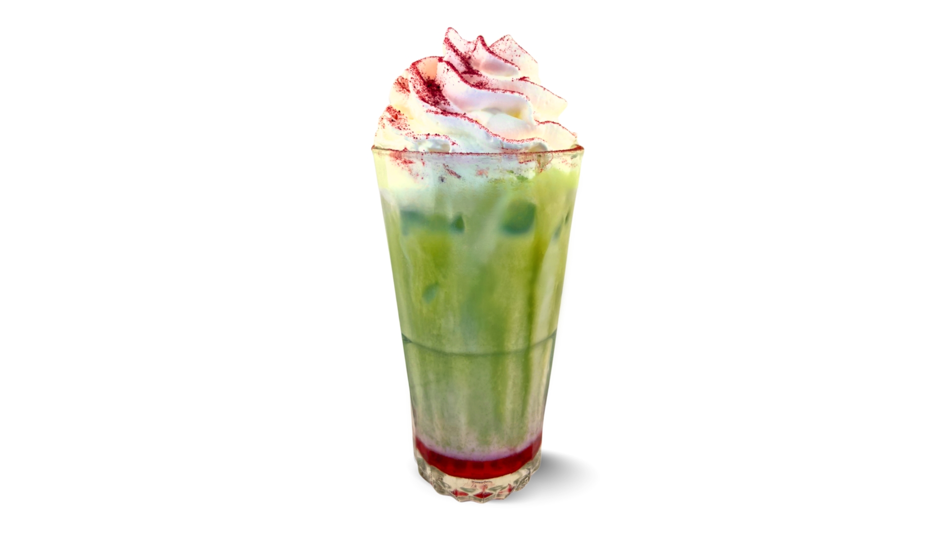 A pastel-coloured pick‑me‑up! Premium matcha, ruby chocolate syrup, milk and cooling ice cubes, topped with whipped cream and raspberry dust.