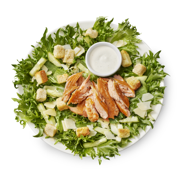 Rapeaa salaattisekoitusta, kurkkua, lämminsavukirjolohta (Suomi/Norja), juustolastuja, krutonkeja, mustapippuria sekä caesarkastiketta (Sis. kalaa)