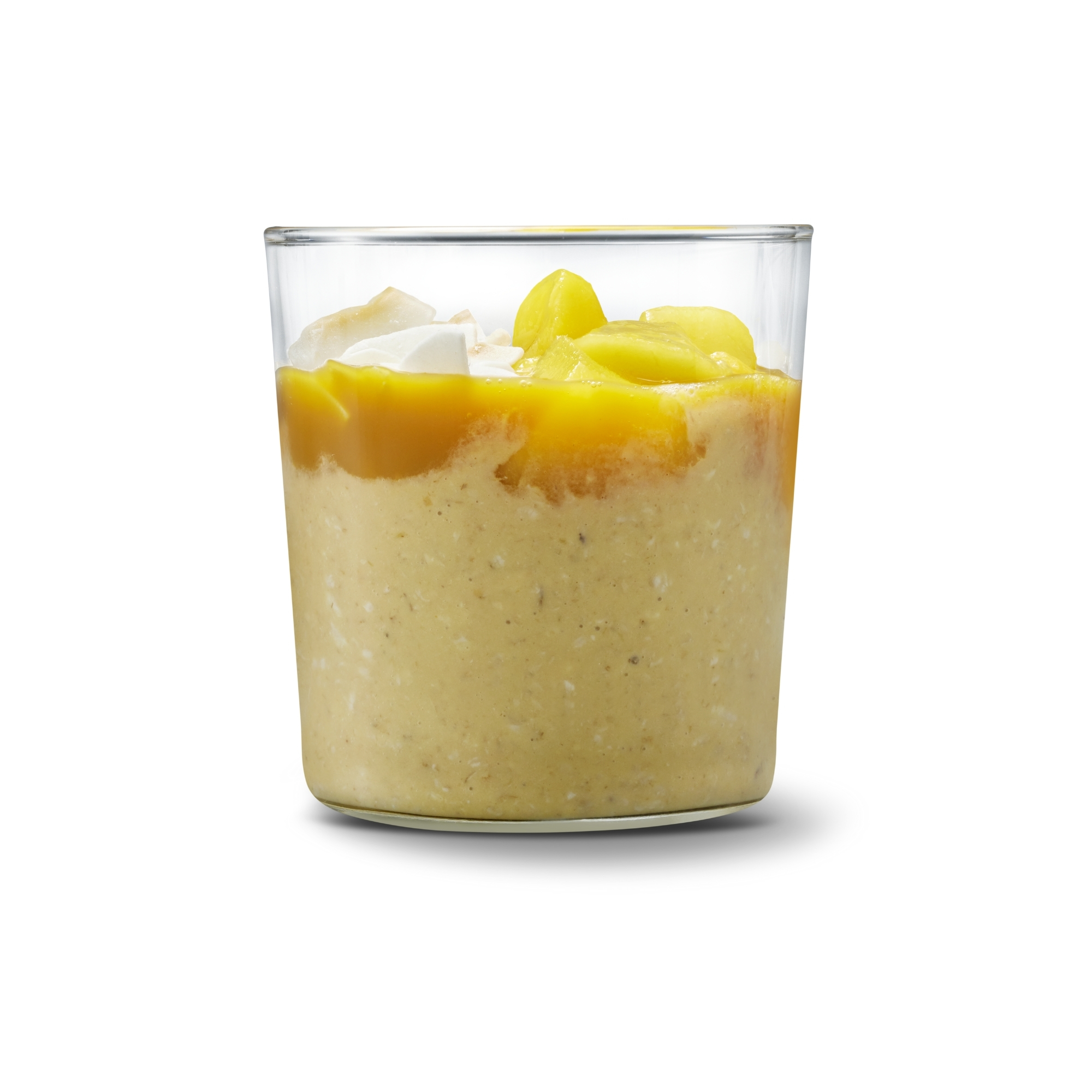 Herkullinen mangonmakuinen tuorepuuro omenalla, mangolla sekä Oddlygood® – mango-kauragurtilla. Päällä Mangopyrettä, mangonpaloja sekä kookoslastuja.