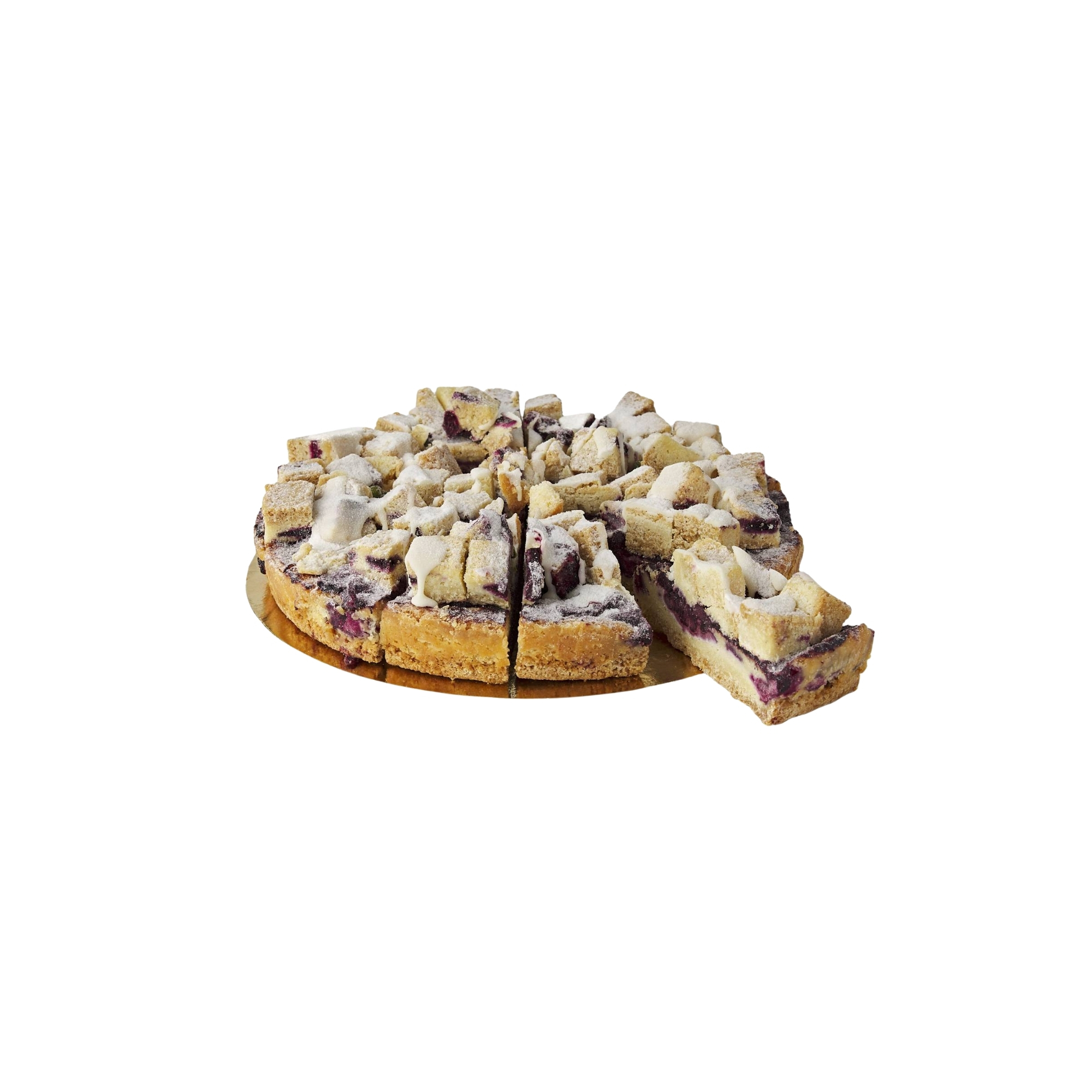 Kakku kätkee sisäänsä runsaasti makeaa mustikkaa ja sen pintaa koristaa ylelliset blondiekuutiot, pistaasipähkinät sekä ihana vaniljakuorrute.