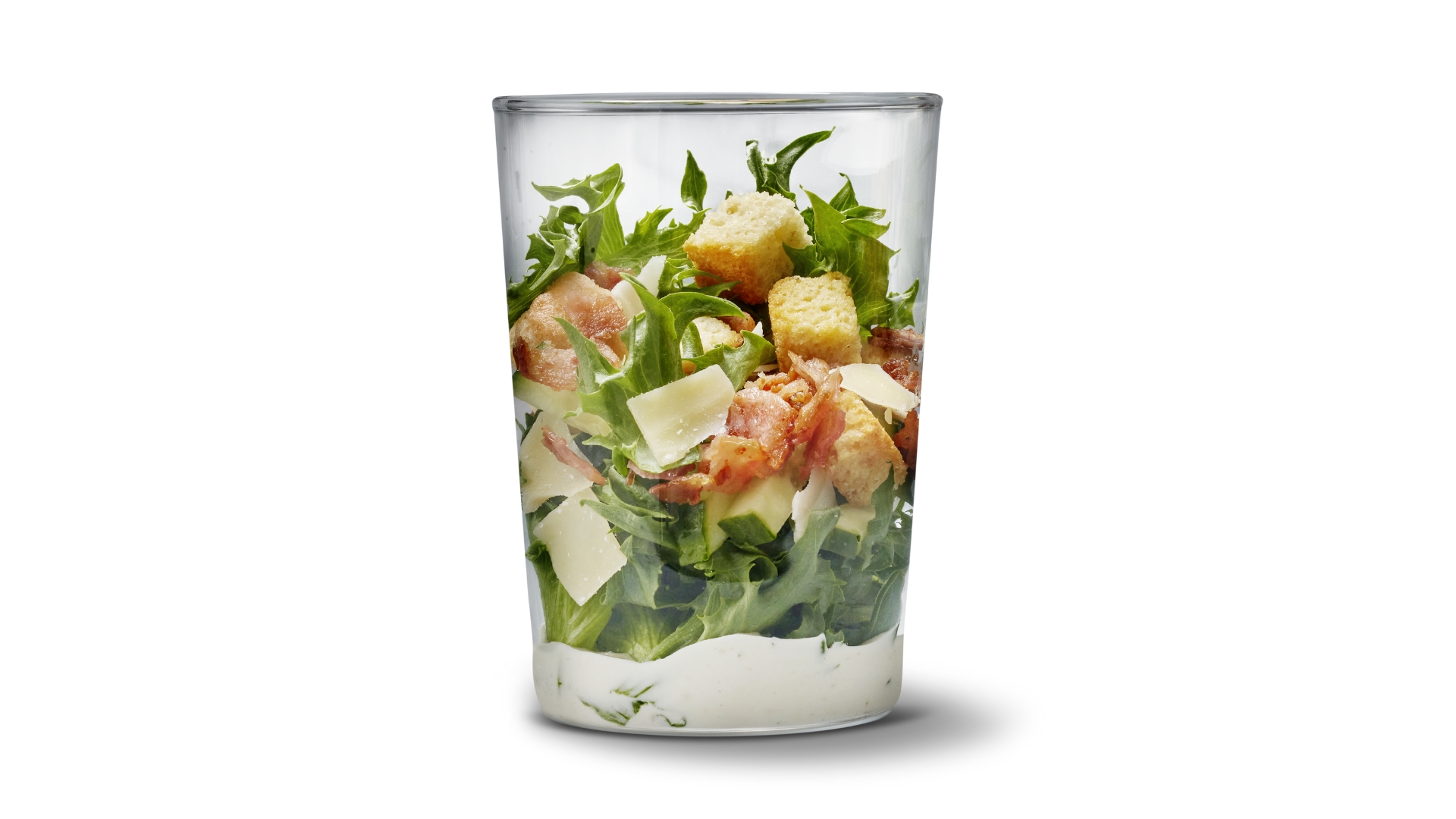 salaattisekoitus (Romainesalaatti (60 %), jäävuorisalaatti (40 %).), kurkku, JUUSTO (Pastöroitu ja raaka MAITO, suola, hapate (MAITO), juoksute), krutonki (VEHNÄjauho (EU ja muu kuin EU), durumVEHNÄjauho (EU ja muu kuin EU), oliiviöljy (8 %, EU), extra-neitsytoliiviöljy (4 %, EU), merisuola (2 %), hiiva, maissi- ja OHRAmallasuute, sokeri, hapettumisenestoaine (E392). Saattaa sisältää pieniä määriä soijaa, sinappia ja lupiinia.), pekoni (Porsaanliha (95,6%), suola, luontainen aromi, hapettumisenestoaineet: askorbiinihappo (E 300) ja rosmariiniuute (E 392), savu (pyökkipuu).)