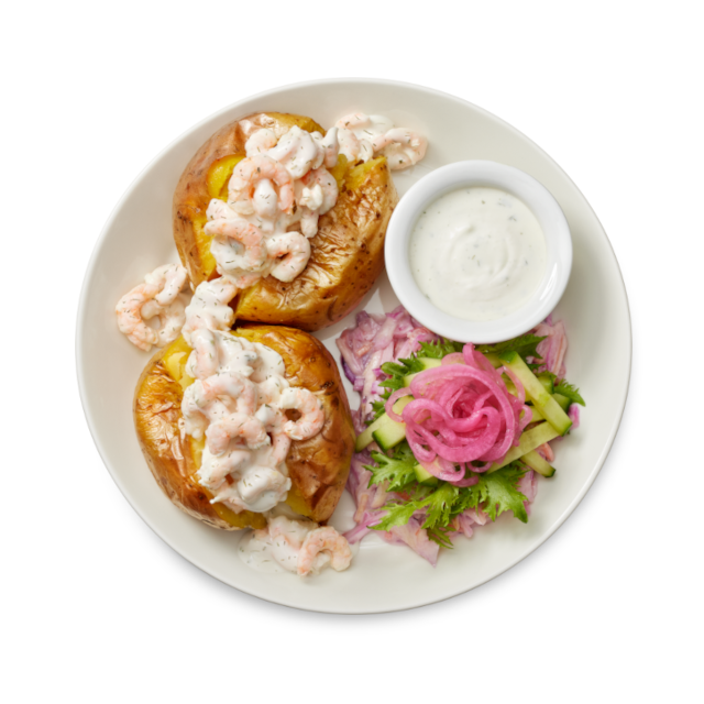 Valmis uuniperuna-annos kahdella uuniperunalla, katkarapu-skagenilla, Picnic-raastesalaatilla, salaattisekoituksella, kaalilla, porkkanalla, kurkulla sekä pikkelöidyllä punasipulilla. Annoksen kruunaa Picnic-uuniperunakastike sekä leipäpala.