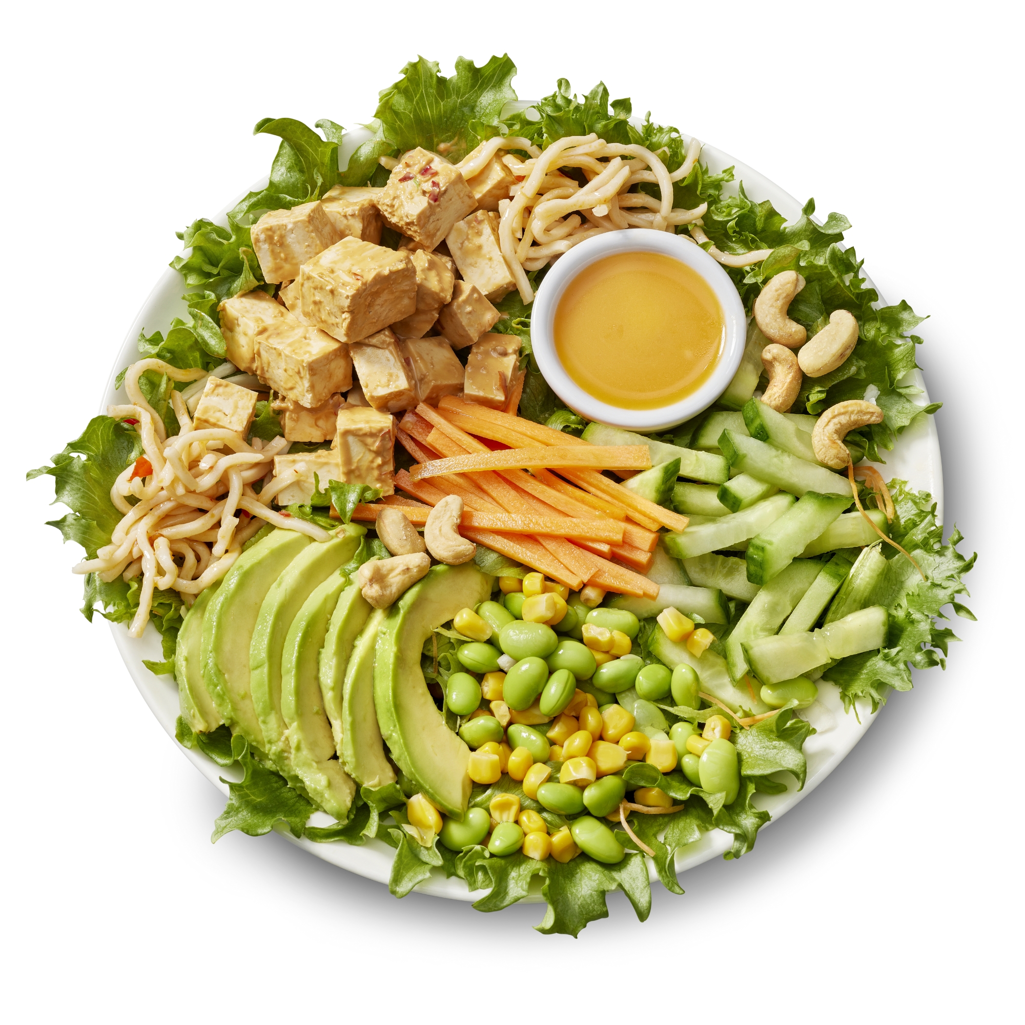 Rapeaa salaattisekoitusta, Aasian bbq- tofua, thai-nuudelia, kaalia, inkivääriporkkanaa, kurkkua, avokadoa, soijapapua, maissia, cashewpähkinää, seesaminsiemeniä, kuivattua chiliä sekä mango-chilivinaigretteä
