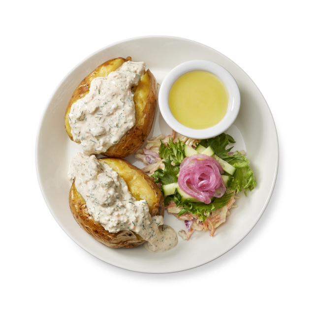 Valmis uuniperuna-annos kahdella uuniperunalla, vegaanisella tofuskagenilla, Picnic-raastesalaatilla, salaattisekoituksella, kurkulla sekä pikkelöidyllä punasipulilla. Annoksen kruunaa Sitruunavinegretti sekä leipäpala.