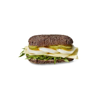 Ruisleivän välissä goudajuustoa, keitettyä kananmunaa, maustekurkkua, levitettä sekä salaattia.