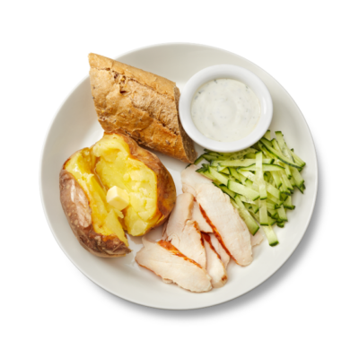 Picnicin lastenateria uuniperunalla, mieleisellä täytteellä, Picnic uuniperunakastikkeella, kurkulla sekä leipäpalalla....