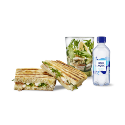Pariloitava lämmin foccaccia kanan fileeviipalella (Suomi), juustolastuilla, salaatilla caesarkastikkeella sekä...