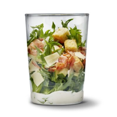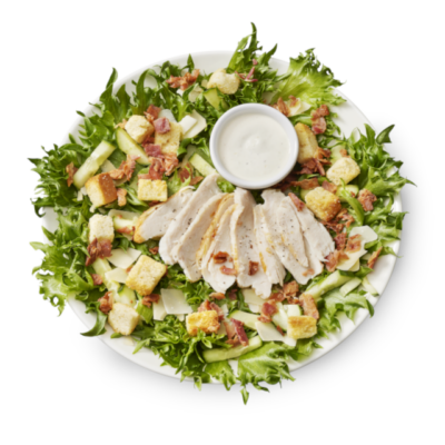 Rapeaa salaattisekoitusta, kurkkua, juustolastuja, pekonimurua, krutonkeja sekä caesarkastiketta (Sis. kalaa)