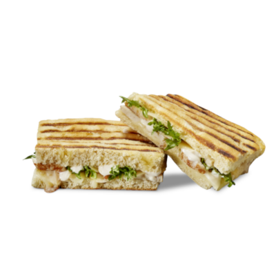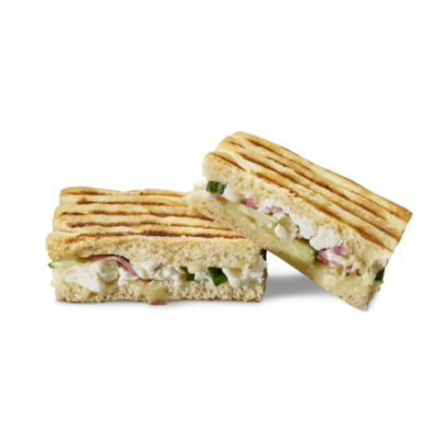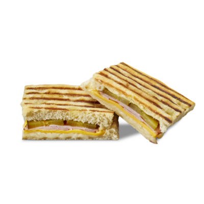 Pariloitava lämmin foccaccia kinkulla (Suomi), cheddarjuustolla, mozzarellallaa sekä maustekurkulla.