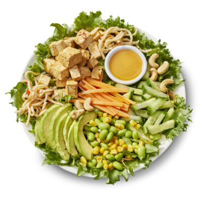 Rapeaa salaattisekoitusta, Aasian bbq- tofua, thai-nuudelia, kaalia, inkivääriporkkanaa, kurkkua, avokadoa,...