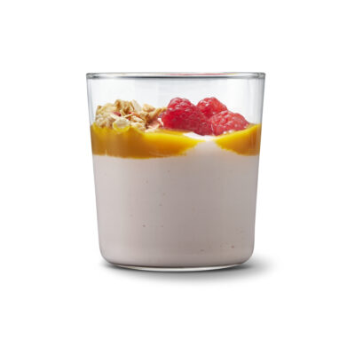Pehmeää vadelmajogurttia, mangopyrettä, vadelmia sekä granolaa.
