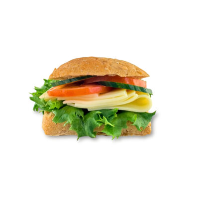 Rapean sämpylän välissä goudajuustoa, tomaattia, kurkkua sekä salaattia.