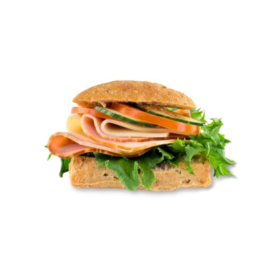 Rapean sämpylän välissä kinkkua (Suomi), goudajuustoa, tomaattia, kurkkua sekä salaattia.