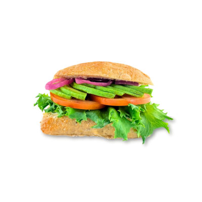 Rapean sämpylän välissä tomaattia, avokadoa, Picnic-remouladekastiketta, pikkelöityä punasipulia sekä salaattia.