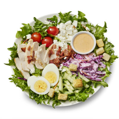 Rapeaa salaattisekoitusta, kanan filee viipaletta (Suomi), fetajuustoa, kananmunaa, pekonia, Picnic-raastesalaattia,...