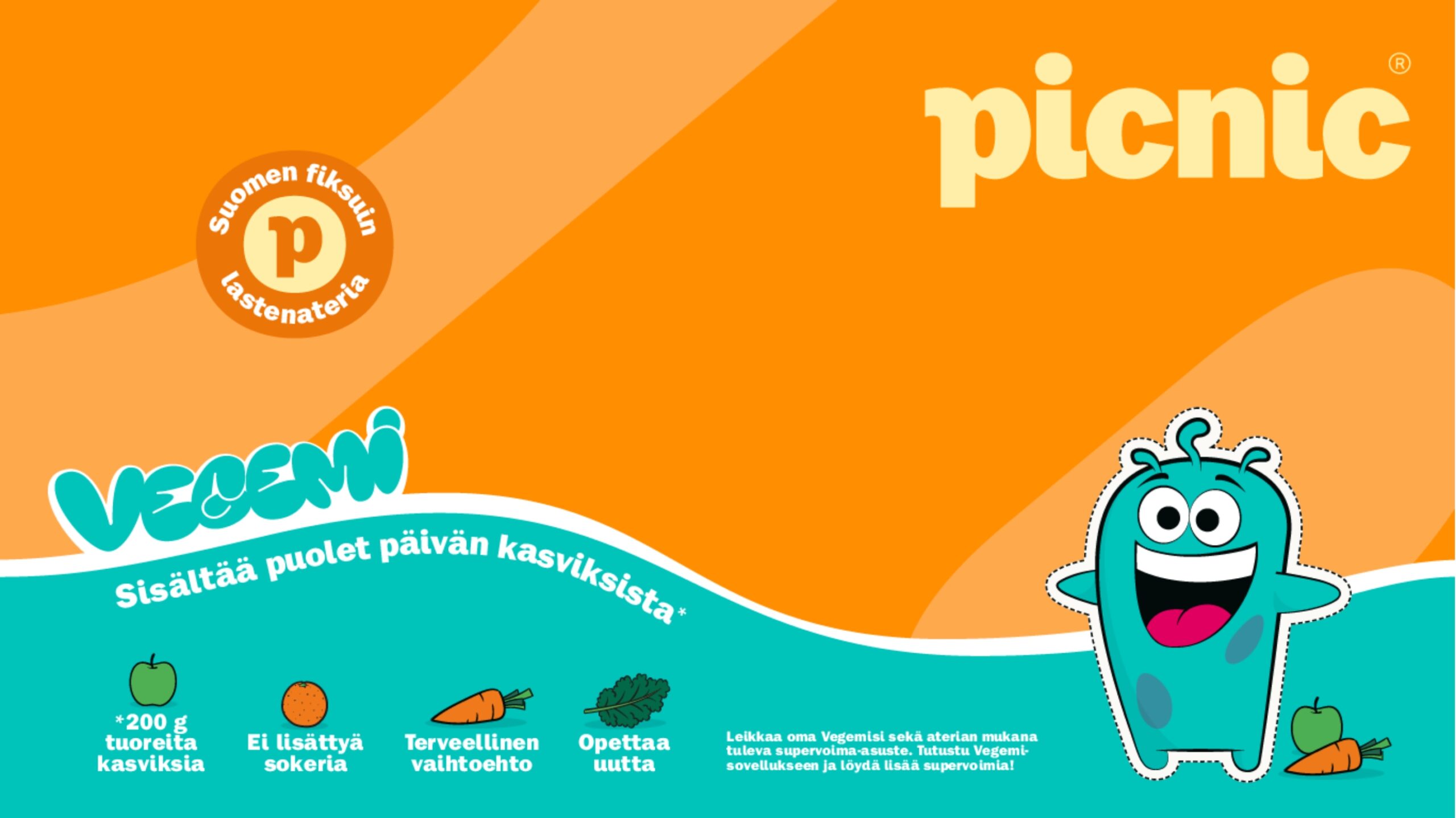 Vegemi on pieni mikrobiomisankari, joka asuu sisällämme ja saa supervoimansa kasviksista. Picnicin lastenateriassa Vegemi kutsuu lapset mukaan seikkailuun, jossa terveellinen ruoka, leikki ja oppiminen kulkevat käsi kädessä.